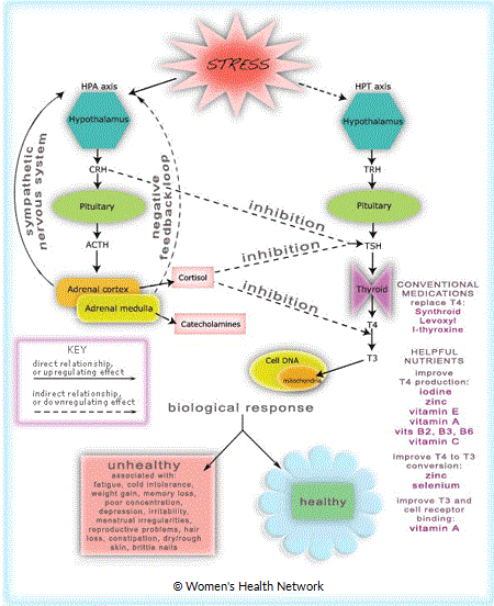 Once a woman’s HPA axis is off-kilter, it’s much more likely her hypothalamic-pituitary-thyroid (HPT) axis will suffer, too. The two are intimately connected — see our diagram of the HPA and HPT axes for a visual. Very often when the thyroid is imbalanced, it actually stems from an adrenal imbalance. Recent research has been demonstrating an association between thyroid conditions and fibromyalgia, which seems more prevalent in women in menopause. While these relationships remain poorly understood, the symptoms we see with hypothyroidism — low body temperature, poor immune function, fatigue, and achiness — can certainly contribute to more intense fibromyalgia symptoms. So the good news is that when we address the hypothyroidism, again, fibromyalgia symptoms can also improve. (See our thyroid health section for more on how to support your thyroid.)